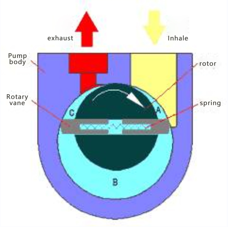 The rotor is installed eccentrically in the pump cavity (stator). There are three slots on the rotor, and the rotary vanes can slide freely inside. The rotary vane divides the internal space into three cavities. The volume of these cavities changes as the rotor rotates. The gas entering the air inlet chamber is compressed and then discharged out of the pump through the exhaust valve.